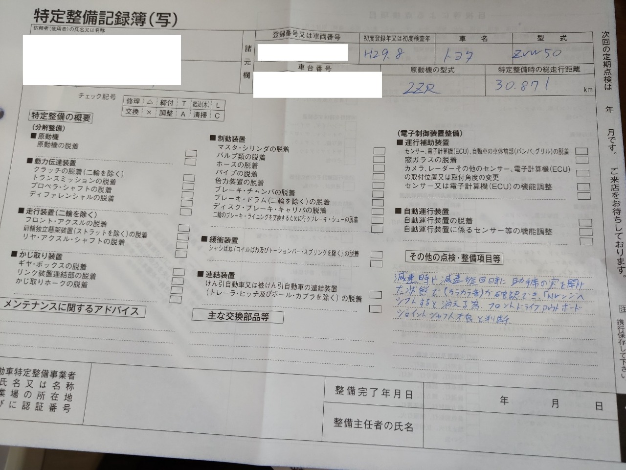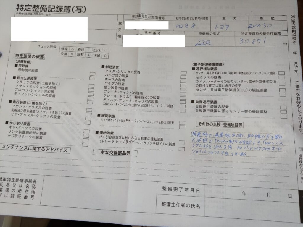 ・当初保証対象外と言われた時、異音が鳴る証拠として整備記録簿だけでも発行してもらう
