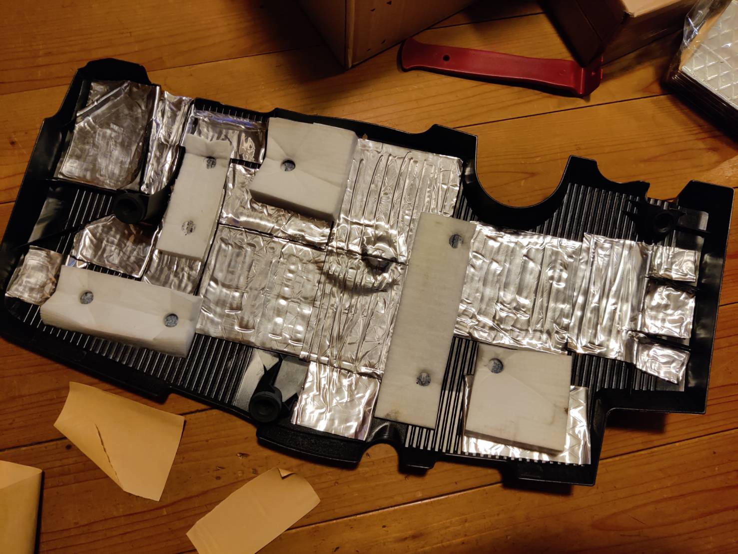 2.エンジンヘッドカバーを清掃・脱脂し、制振材→ゼトロ耐熱吸音シートを貼ります。