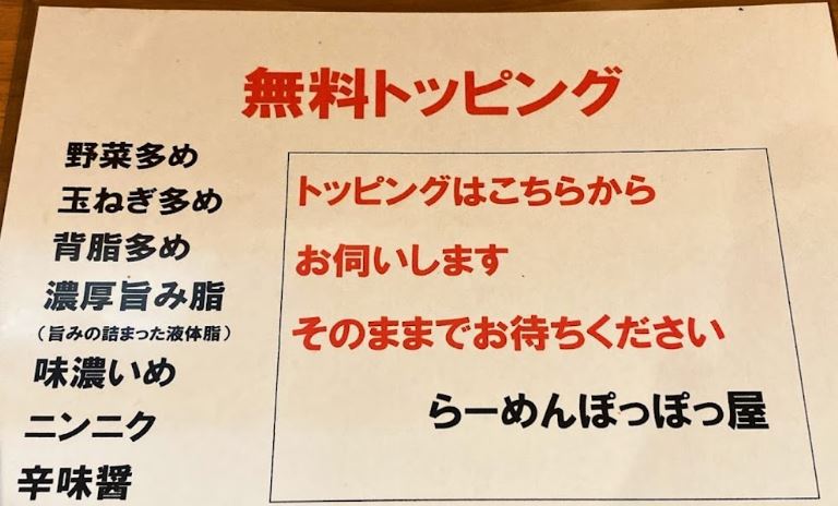 提供前にトッピングを聞かれるので、タマネギ・ヤサイ・ニンニク・カラメ・脂多めなどいろいろ頼めます!