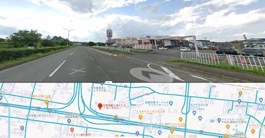 国道107号線沿いにあります!北上ICから、すぐの所です。合流してくる車がいたため、上手く入れず迂回して入ることになりました笑